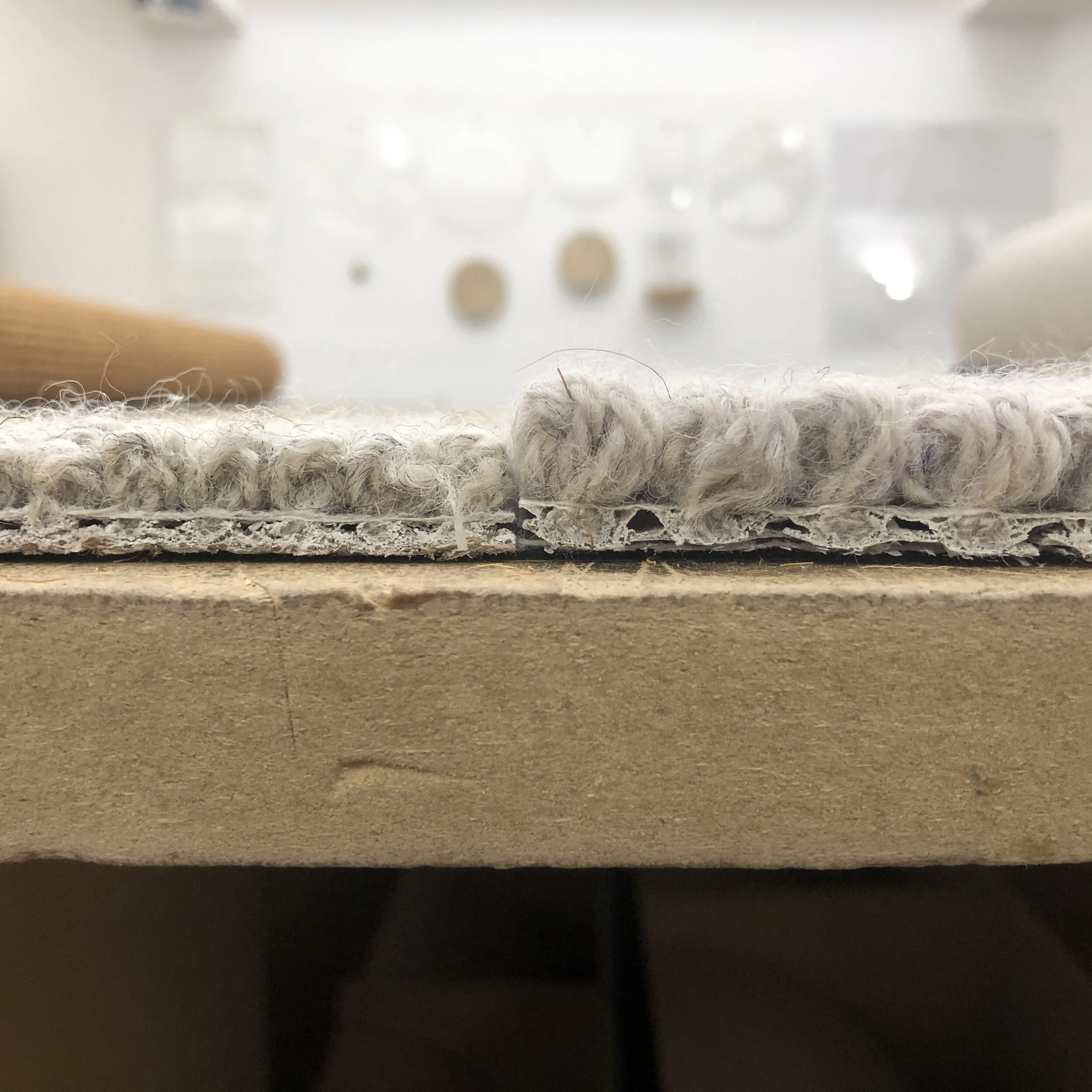 For reference the finishes below are Pale Grey Rustica (left) & Silver Squirrel Alaska - both ranges have a white backing mebrane that does become partly exposed around Wrapped Ends, Access Holes & Recessed Tops when the carpet is folded.