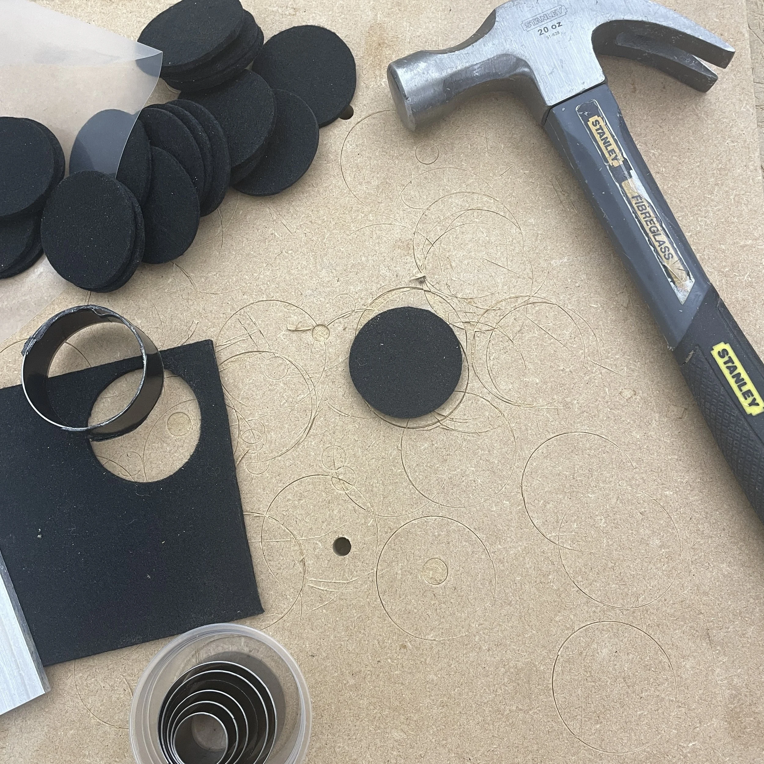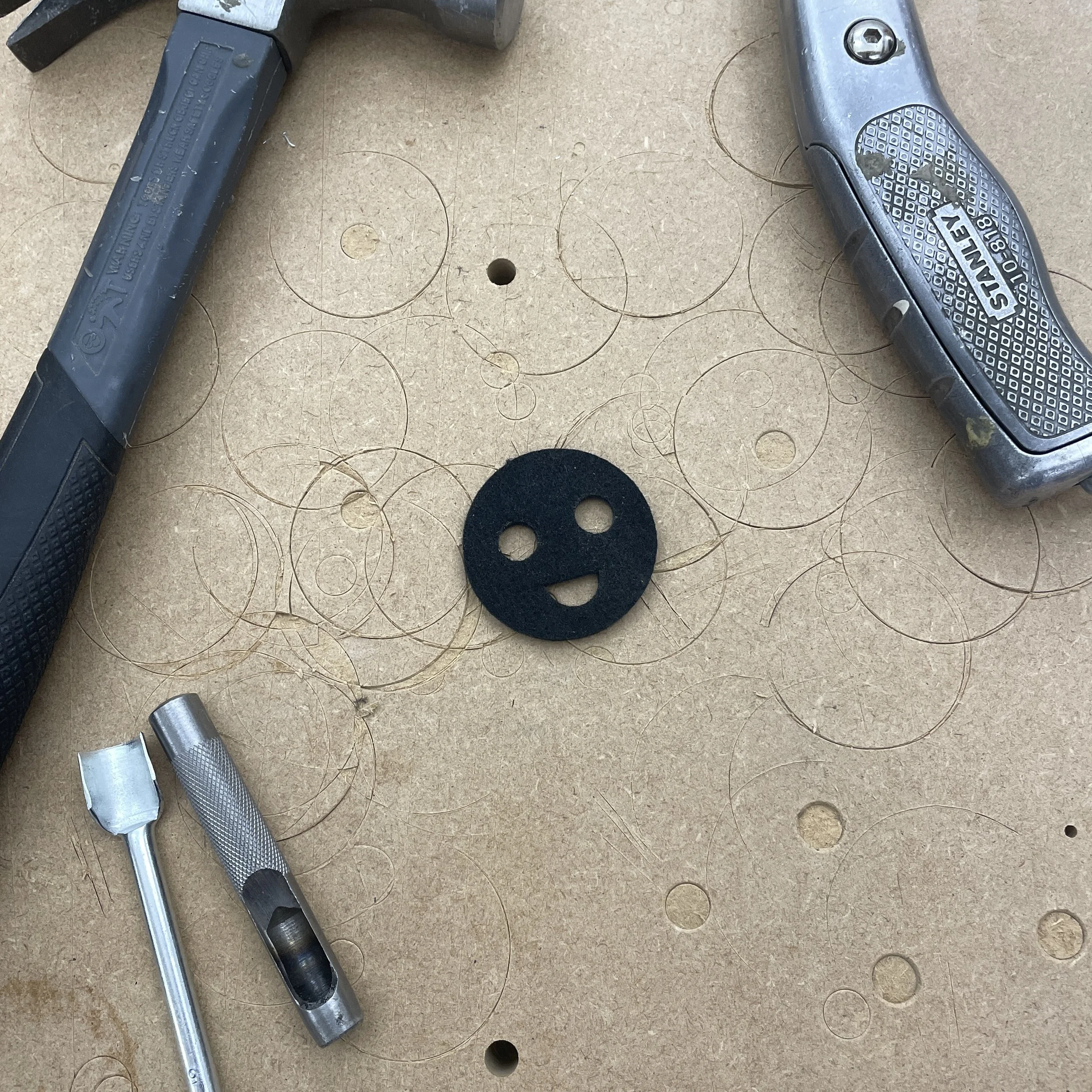 Dotti was being cut by hand using a metal washer as a template but we are now using a leather punch to form the disc - we’ve also updated the face on Dotti to a new joyful smile to match its new clean cut image.