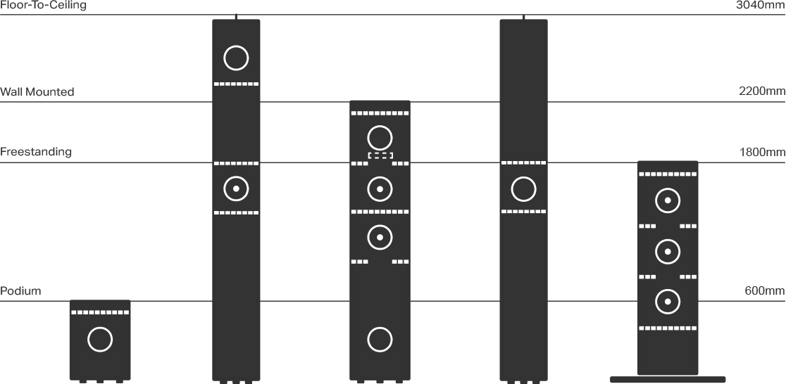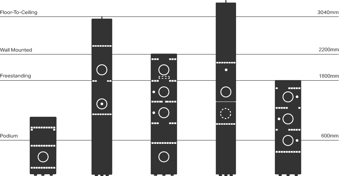 Fatcat can be specified as a floor-to-ceiling, wall mounted or freestanding unit.