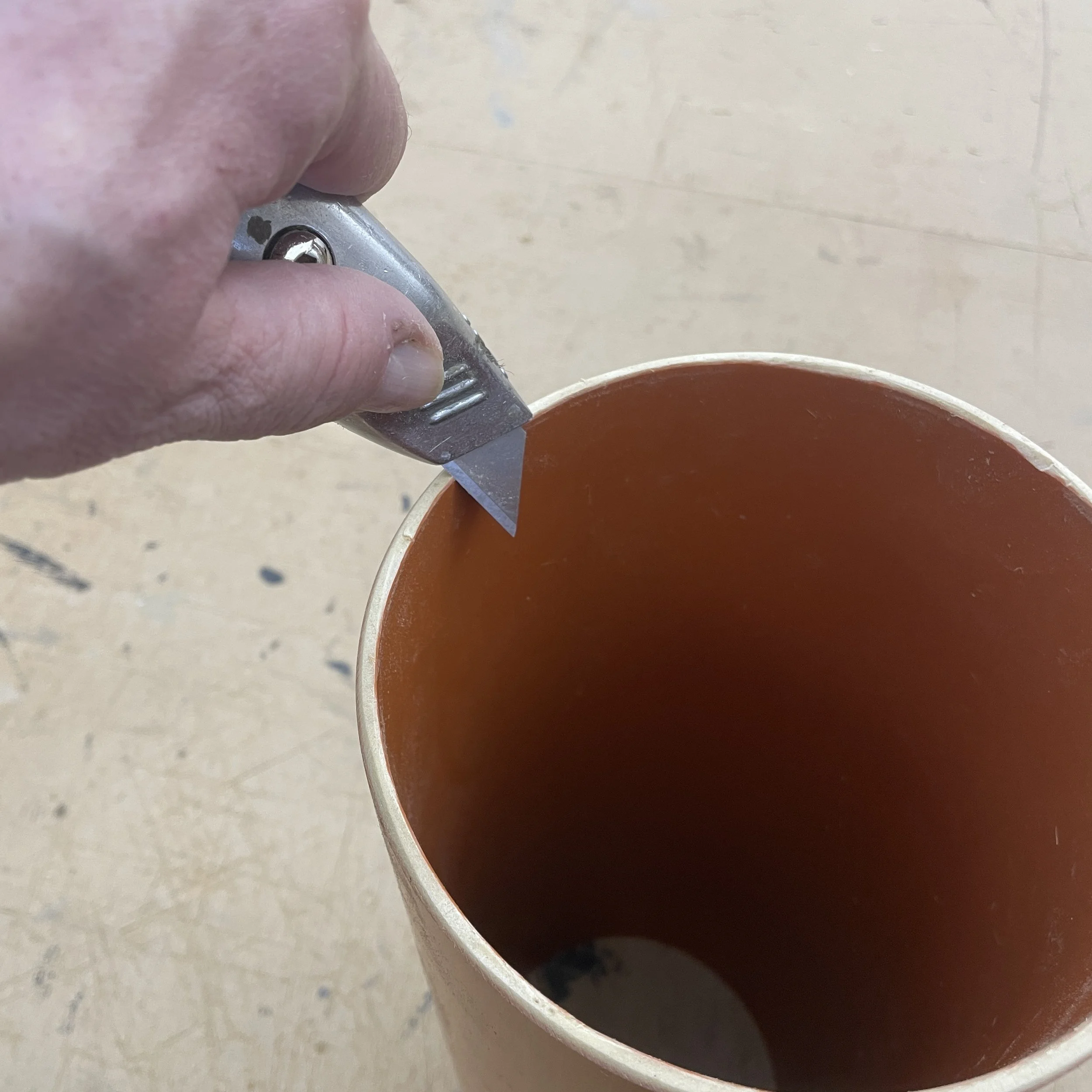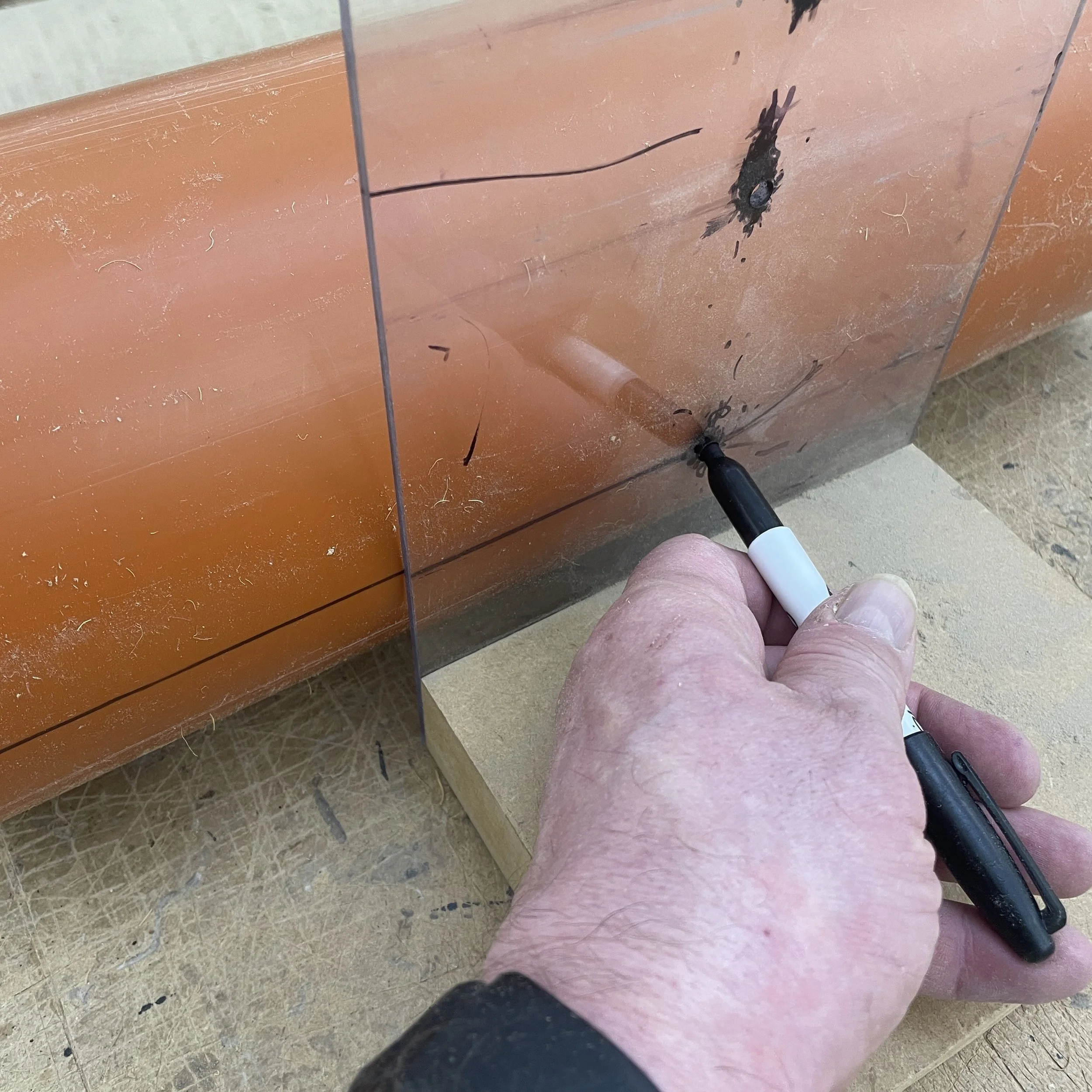 Scribe a horizontal line along the length of the cut tube - we use a template to do this but you can rest a pen on top of anything that’s approximately 8cm tall then run it along the length of the tube.