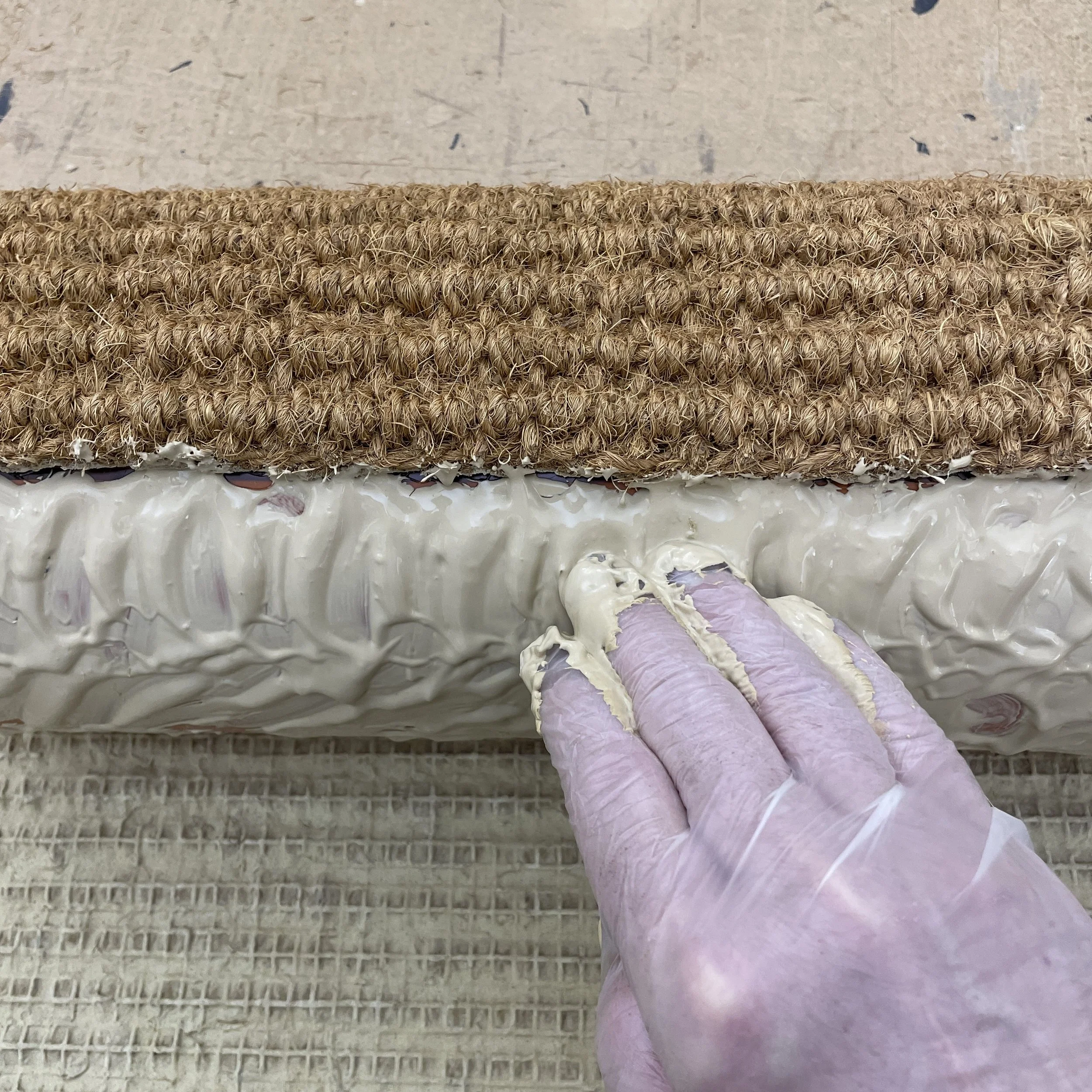Apply the adhesive on to the tube in sections rotating the tube as you working up to the seam - try to apply a line of ridges along this point to help with fixing the carpet again noting that parquet flooring adhesive works better than just flooring adhesive when fixing coir carpet.