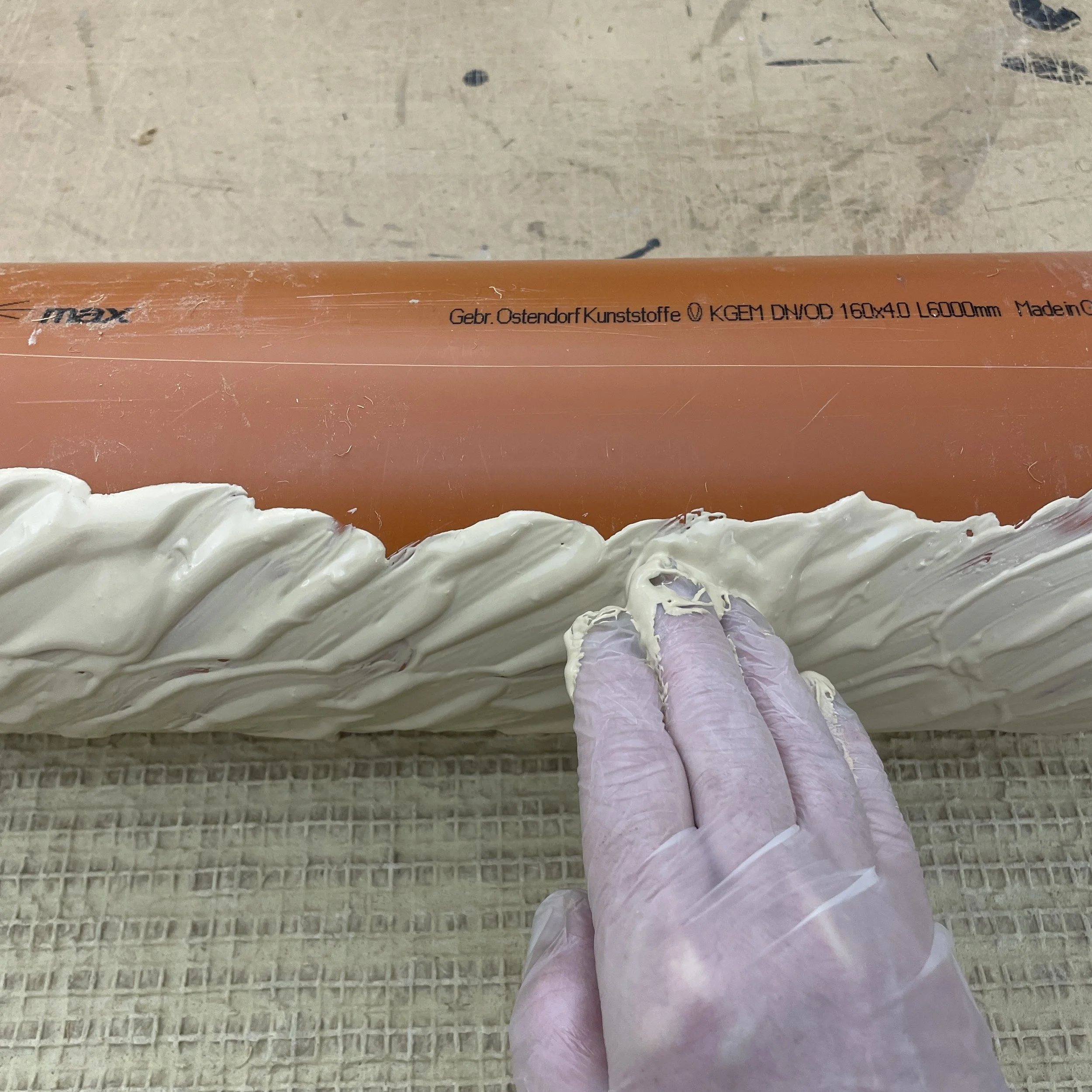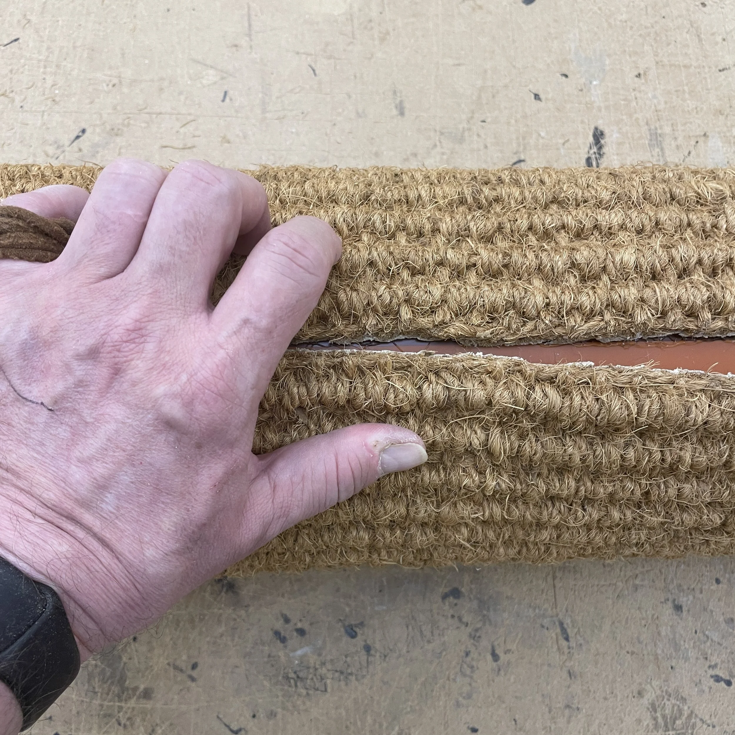 Then work the fabric around the tube making sure that there is no give in the carpet & the wrap is as tight as possible - it will be easier working the coir around the tube if you place it on a carpeted floor then massage the coir whilst rotating the tube bit-by-bit as the carpet will will help to hold the wrapped sections tight.
