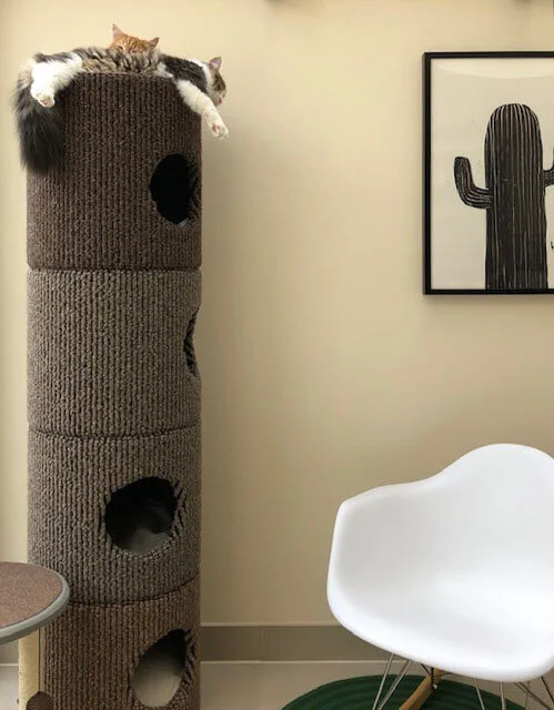 Our designs are driven by cat behaviour & centred around cat climbing trees that are safe, functional & that maximise vertical surface area but with a compact footprint - they provide an all limbs climbing experience, as opposed to just back limb jumping from perch to perch, that's focused on energetic play, secluded relaxation & providing lots of entertainment for both you & your cat.