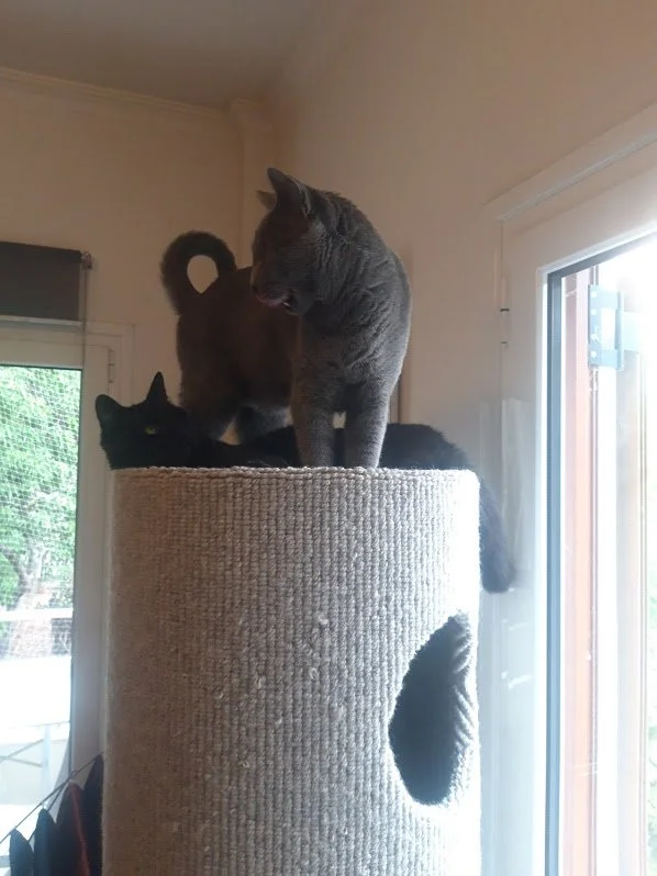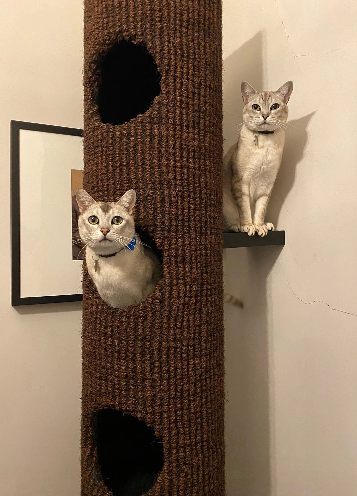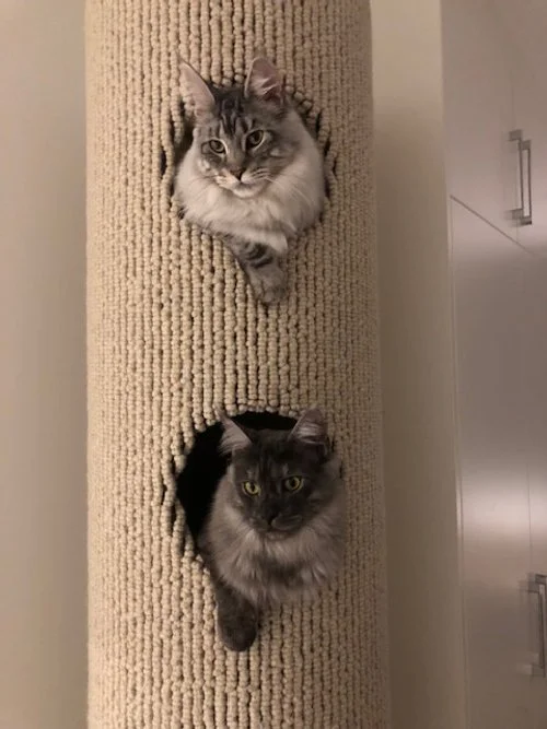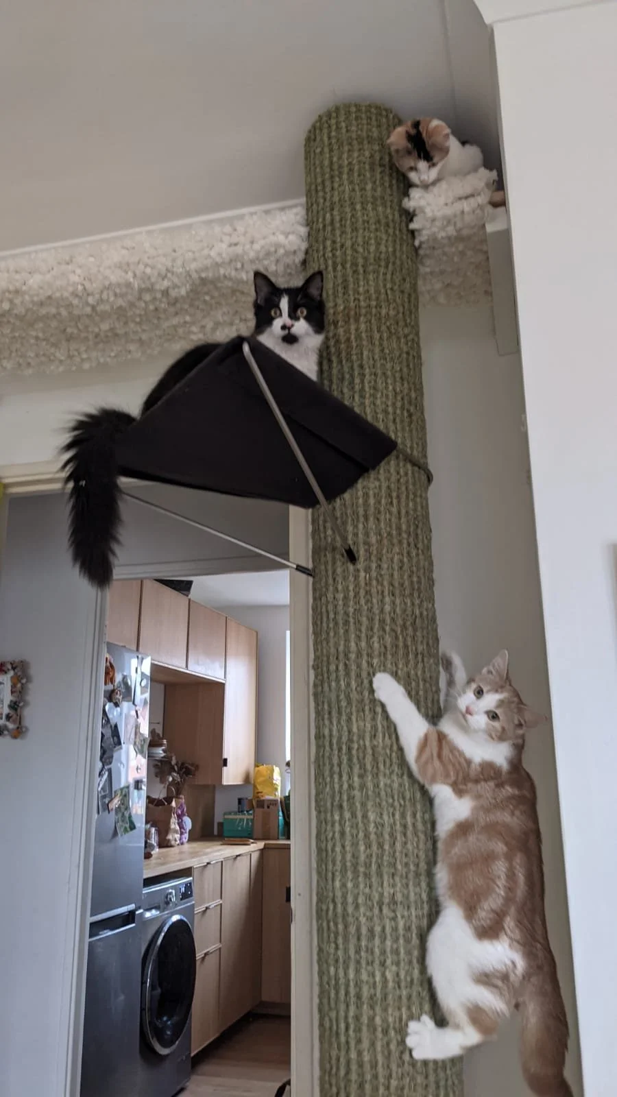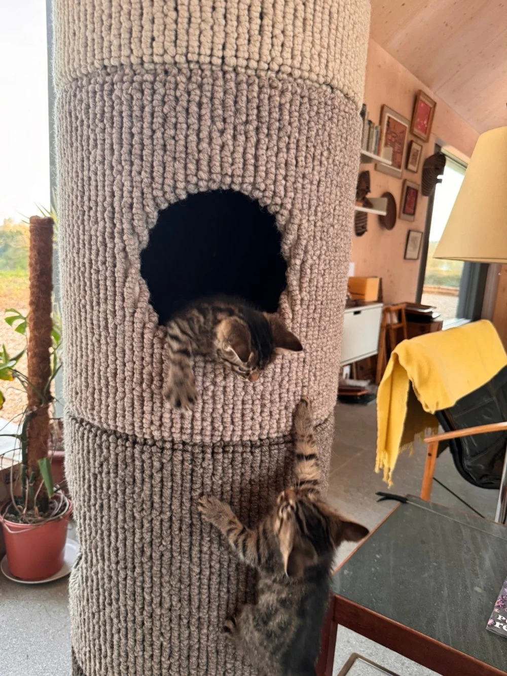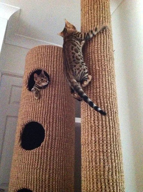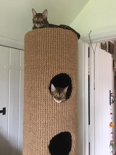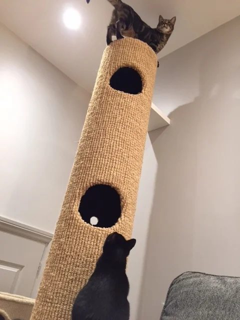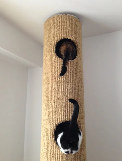 “The cat poles are in & they are a hit. They were playing in them as soon as the plastic came off and have been up, on, round, climbing through ever since. The bottom hole is their new home (very cute - the two of them cuddled up together purring contentedly) and they love fighting each other through the holes - totally hilarious. They are no longer jumping up the walls (literally) as they don’t need to. Must be so much better for both their mental and physical well being.