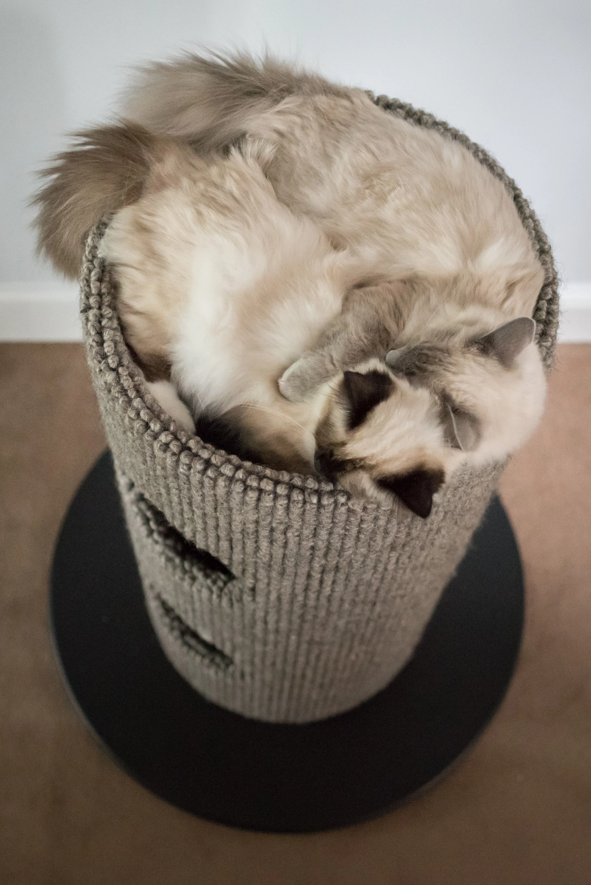 “Just to let you know that getting the bird’s nest is about the best advice you could have given me. There’s always at least one cat asleep on top, mostly two and sometimes even three. Because the bird’s nest is deep there’s no danger of any cat falling out. They love it, as you can see on this picture. The wool gets scratched quite heavily because they love climbing and scratching and it sheds a little, but not too much. I will keep you updated on durability.”